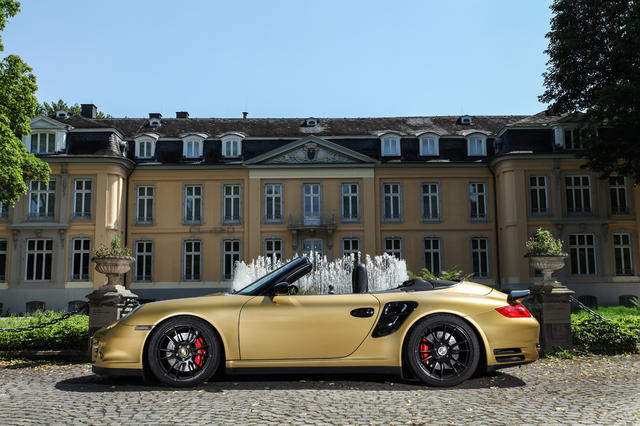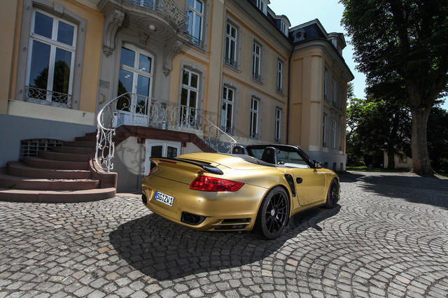 ![]() Wimmer RS??T專精的品項相當多,尤其是Chiptuning這部分,而這次為Porsche 911 Turbo Cabriolet推出完整升級套件,并使用貼膜將車身改為金色,成為一輛獨一無二、絕無僅有的金色敞篷Porsche。 Wimmer RS??T為這具3.6L水平對臥雙渦輪發(fā)動機推出升級套件,諸如渦輪機、火星塞、強化管路、強化汽油泵浦等,當然也包含ECU改寫程式,而Wimmer RS??T也為911 Turbo Cabriolet換上專用排氣強化系統(tǒng),套件中含有金屬觸媒與電子可調(diào)式排氣閥門,以及強化離合器組以對應(yīng)增加的動力,而911 Turbo Cabriolet在經(jīng)過上述強化之后,最大馬力到達840hp,最大扭力更從63.3 kgm提升至88.8kgm,從靜止加速到120 mph(約192km/h)僅需10.1秒,極速可到達216 mph(約346km/h)。
