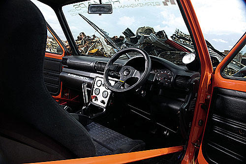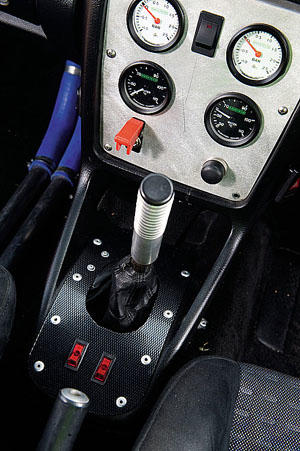 | 內(nèi)飾配備:Evo.8 Recaro可調(diào)式跑車(chē)座椅,Audi A4儀表座,OMP方向盤(pán),特制排檔頭,PRS安全帶,后座拆除,特制鋁合金中控臺(tái)含輔助開(kāi)關(guān),儀表座上額外加裝轉(zhuǎn)速表,雙增壓表,特制鋁合金油箱。 |