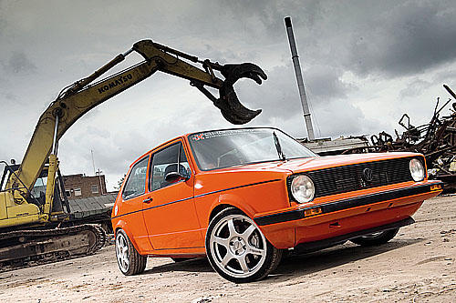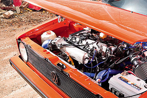 把這輛戰(zhàn)神紅的一代Golf停在拆解完畢的廢棄鐵堆之間,很容易會(huì)讓人以為這只是另一輛報(bào)廢的VW,只有眼睛最銳利的狂熱分子才會(huì)注意到它的8x16寸Speed??line賽車(chē)鋁圈、以及六根輪輻里面所隱藏的移植Hi-Spec高規(guī)格大型剎車(chē),但是當(dāng)你將發(fā)動(dòng)機(jī)蓋以及尾門(mén)都打開(kāi)時(shí),就非常有趣了:前面是一具四代Golf GTi的心臟、后面則是來(lái)自Audi A3,動(dòng)力經(jīng)由一對(duì)Corrado G60五速變速箱來(lái)傳輸,這兩具變速箱經(jīng)由手工特制纜線系統(tǒng)連接在一起、以合并兩具發(fā)動(dòng)機(jī)的動(dòng)力。