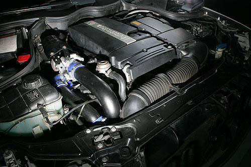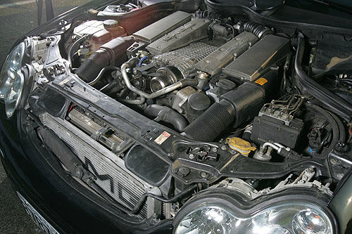 這輛C200K正是以M111的2.0升鑄造發(fā)動(dòng)機(jī)為基礎(chǔ),藉由更換噴油嘴提升原廠供油量,加上汽油調(diào)壓閥與汽油泵浦調(diào)整汽油壓力,而機(jī)械增壓普利盤也更換成加大物品以提高增壓值。至于一般提升進(jìn)排氣量采用歧管內(nèi)部拋光以增加流速。在進(jìn)氣量提高的情況下排氣端更是改裝上的重點(diǎn),要避免排氣回壓過高而影響發(fā)動(dòng)機(jī)運(yùn)作,甚至產(chǎn)生排氣溫度過高的危險(xiǎn)情形,因此改裝者特別以加大管徑的手工排氣管以增加排氣效率。