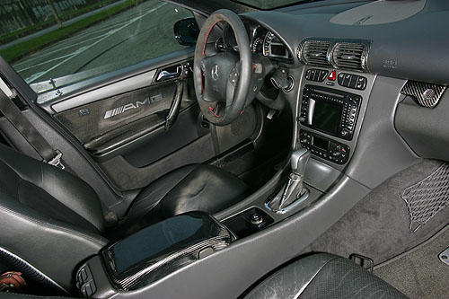 打開車門一看大面積的碳纖維紋路早已完全取代原廠皮革設(shè)計(jì),不論是中央扶手、內(nèi)飾飾板與皮革,甚至連儀表板、椅背與A、B、C柱都完全更換為碳纖式樣,極為運(yùn)動(dòng)化的氛圍使得舊款W203也能有新車的質(zhì)感,而內(nèi)飾除了大量采用與眾不同的碳纖維裝飾之外,還有W203車型極為罕見的后座兒童座椅也在此車現(xiàn)身,原來這是C55 AMG車上的標(biāo)準(zhǔn)配備,在一般C-Class車型(W203)上并未列入選配。