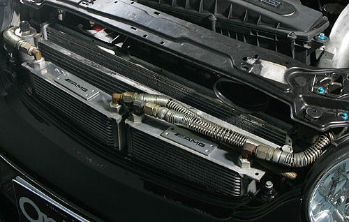 | 高Bar數(shù)的機(jī)械增壓所帶來的額外熱能,光是依靠原廠配置的散熱系統(tǒng)肯定炸發(fā)動(dòng)機(jī),為了要確保發(fā)動(dòng)機(jī)能維持正常耐用度,除了換上加大水箱與增加水泵浦之外,相關(guān)的機(jī)油與變速箱仍需加裝冷卻器以維持其工作溫度。 |