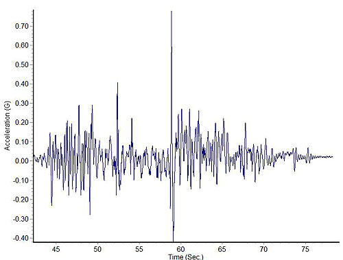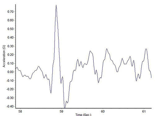 在較硬的懸掛設計下,這部GTI所安裝的Sachs套裝避震器,所顯示出來的上下G值曲線圖之上下振幅硬是短了許多,且每條垂直曲線的間隔也緊密許多,正說明本組避震器所提供的彈跳反應為短又快,若能搭配設定良好的阻尼,將能提供車輛相當不錯的操控性能,實際試駕后的心得也是如此。此外,該組避震器在遇到水溝蓋坑洞時,雖然瞬間的上躍值高達+0.78G,不過下沉值只有-0.42G而已,代表避震器很快地就將彈簧控制住,沒有出現彈簧過度伸張的情形,阻尼可以完全控制住彈簧的彈跳,事實上這次所有的受測產品中皆有如此高水準的表現,進口產品確實有其一定的水準在。