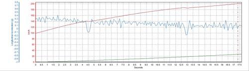 不過高達4.785終傳的變速箱必須更換兩次檔才能完成計測,而小排氣量的自然進氣汽車果真相當(dāng)不利于高速戰(zhàn)場,通過200km/h時也僅剩下0.042G的加速力道,不過17.24秒的成績也算是具有相當(dāng)水準(zhǔn)的表現(xiàn)。