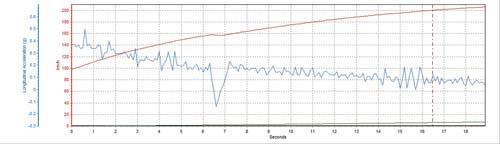 TD04的反應(yīng)果然夠快,105.7km/h即可發(fā)揮最大G力,四檔后依舊可發(fā)揮0.2G上下的加速力道,最后則是以0.105G通過200km/h處。 (換檔部分圈起) 3檔換4檔:0.89秒 |
