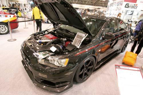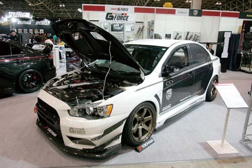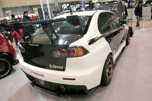 | 這部同樣是由G-Force的EVO X廠車,為什么說是廠車呢?因?yàn)樗且徊縿傇谥ㄙ惖乐信艹?7秒963成績(jī)的EVO X,從其外觀來看前后車門、發(fā)動(dòng)機(jī)蓋與行李廂蓋都已換成Varis所推出的碳纖維制品,動(dòng)力部分則除了利用Tomei鍛造腹內(nèi)套件,將排氣量提升到2234c.c.外,還將渦輪換成HKS GT-3240渦輪本體,一舉將發(fā)動(dòng)機(jī)出力提升到570hp/7000rpm、66kgm/4000rpm的等級(jí),至于測(cè)時(shí)所使用的輪胎則為265/35R18規(guī)格的Advan A050 |