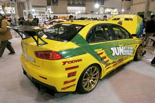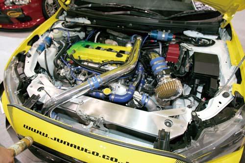 | 日本EVO改裝大廠JUN對(duì)于EVO X改裝套件的研發(fā)腳步,當(dāng)然不能比其他店家來得慢,以這部展示車為例,動(dòng)力部分全套鍛造腹內(nèi)機(jī)件是壓榨強(qiáng)大動(dòng)力時(shí),不可少的必備套件,且還領(lǐng)先同業(yè)率先推出缸徑×沖程=87×97mm的2306c.c.排氣量套件,壓縮比為8.8:1。至于渦輪則采用TD06-25G,其高轉(zhuǎn)速高出風(fēng)量特性,將有助于最大馬力的推升,其他改裝套件尚有JUN 272度凸輪軸、JUN加大中冷器、JUN Front Pipe、Trust全段排氣管/機(jī)油冷卻器與Sard 265l汽油泵浦/1000c.c.噴油嘴×4,在增壓值設(shè)定于1.6bar時(shí),可輸出630hp/7780、67.4kgm/5300rpm創(chuàng)紀(jì)錄的動(dòng)力表現(xiàn),再一次證明JUN高超的改裝實(shí)力,目前筑波最快成績(jī)?yōu)?9秒292 |