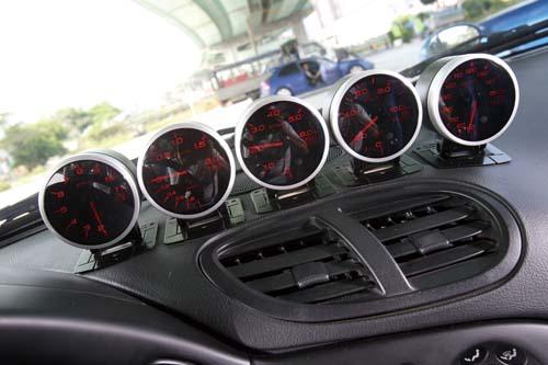此車上監(jiān)控儀表全數(shù)使用Defi制的高檔物品,由左至右分別為排溫、增壓、燃壓、油溫、油壓表。 |
