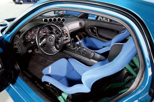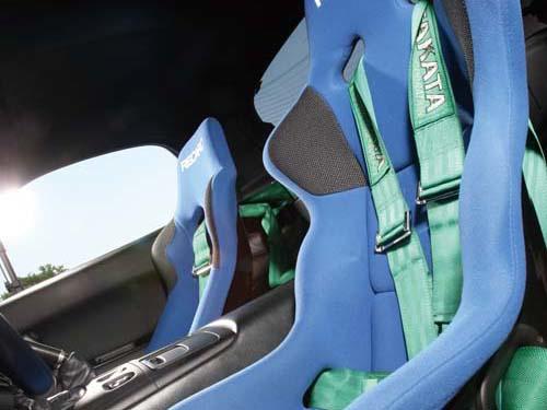 兩張藍(lán)色Recaro賽車桶椅可以緊緊固定駕駛與乘客,是改裝車輛不可獲缺的用品。 |