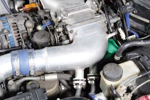 在進(jìn)氣方面使用了HKS香菇頭,而進(jìn)氣冷卻器則為Blitz物品,這具Intercooler容積頗大且冷卻效果佳,對應(yīng)此車可說是相當(dāng)適合,進(jìn)、排氣泄壓閥使用的是GReddy與HKS GT II制品,排氣部分使用HKS專用的渦輪頭段與自制90mm口徑之中尾段排氣管,不但排氣效率高,當(dāng)發(fā)動機高速運轉(zhuǎn)時的聲浪就像純種賽車一樣驚人。
