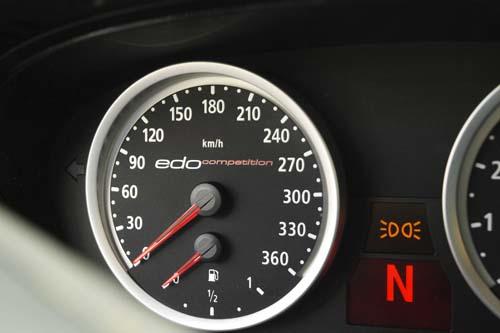 為了符合edo Competition向來所營造的高性能氣勢,從前、后保桿下擾流與尾翼有效利用空氣力學(xué),除了確保發(fā)動機(jī)進(jìn)氣量能充足之外,冷卻與降低空氣阻力也是必要的考量重點,尤其在車尾不銹鋼四出尾管裝扮之下低沉飽滿的發(fā)動機(jī)待速聲真是令人難以抗拒。此外20寸輕量化鍛造輪轂配合前255/35 R20后285/30 R20性能胎讓edo M5 Dark Edition高性能得以完全發(fā)揮,0~100Km/h只需4.2秒較原廠縮短0.5秒,即使從0加速200km/h也可在10秒內(nèi)完成。內(nèi)飾方面不論碳纖維材質(zhì)與珍貴皮革,從內(nèi)飾板到座椅等都可完全依客戶需求訂制,不過最讓人喜愛的還是這組將時速延伸至360km/h的儀表,白色表盤與背光標(biāo)志最具吸引力。
