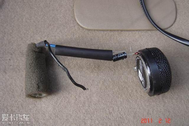 1:JBL鈦膜高音(可以看到中間很亮的振膜,反面的磁鋼也很大,直徑大約3CM) ![]() ![]() 2、不知名絲絹高音單元 ![]() ![]() 準(zhǔn)備工作: 1、高音單元一對(duì)(要跟賣家確認(rèn),單元的最大直徑不能高于3.8厘米,否則裝不進(jìn)去,硬裝會(huì)損傷原車的塑料件) 2、電烙鐵一把 3、熱熔膠槍一把(沒(méi)有的話用打火機(jī)直接燒膠棒,讓膠直接滴下去也行) 4、焊錫絲一段 5、電容數(shù)個(gè)(50V-3.3微法無(wú)極性電容,如買不到無(wú)極性電容也有辦法,后面會(huì)講的) 6、小一字起和十字起各一把 7、美工刀一把 8、熱縮管一段 9、打火機(jī)一個(gè)(用于燒熱縮管哈,沒(méi)有也可用烙鐵烘烤) 10、150W電源逆變器一個(gè)(沒(méi)有的話就拆下拿到家里焊,也一樣) 開(kāi)始動(dòng)手: 1、用一字小起子撬開(kāi)高音喇叭的外罩(這個(gè)因?yàn)橥浥恼樟?,所以沒(méi)有圖片。。。),只要輕輕的撬上邊和靠近儀表臺(tái)的那條邊就可以了,很輕松就可以撬下來(lái),兩邊門一樣的方法。 2、用十字起拆下的原車高音喇叭總成 ![]() 3、拆下的原車高音單元,明顯看得出磁鋼很?。ㄖ虚g很亮的部位),這么小的磁鋼肯定出不了好聲音哈 ![]() 4、把要裝的JBL高音放到外罩里比劃一下大小,尺寸剛剛好,呵呵(就是照片有點(diǎn)模糊,NND,對(duì)不起大家了) ![]() 5、把原車帶插頭的連接線用烙鐵焊下來(lái),在藍(lán)色線(正極)上焊接上電容(50V 3.3微法無(wú)極性),在焊接到喇叭正極(一般在喇叭正極焊點(diǎn)位置涂有紅色)之前先套上熱縮管。 ![]() PS:我用的是原車的電容(拆原車電容要用美工刀隔開(kāi)粘在上面的橡膠),如果各位不想拆下原車電容就用自己的電容,如果沒(méi)買到無(wú)極性電容的話可參照下面的方法。(需要注意的是在連接的時(shí)候,要將正極和正極焊接在一起或者負(fù)極和負(fù)極焊接在一起,這樣就變成無(wú)極性的了) ![]() 6、用打火機(jī)燒熱縮管,讓它收縮,好處是絕緣和保護(hù)電容(沒(méi)有的話用電工膠帶也可以) ![]() 7、把焊接好的高音單元放到外罩里面,用熱熔膠固定好,熱熔膠的支點(diǎn)就是拆下螺絲的位置 ![]() 8、裝回原位、通電、開(kāi)音響試音。。。。搞定,哈哈 升級(jí)后感覺(jué):效果提升非常明顯,原來(lái)就算耳朵湊到高音喇叭邊上也只能聽(tīng)到很輕微的絲絲聲,現(xiàn)在坐在駕駛位上就很清楚的聽(tīng)到清脆的高音了,而且實(shí)際測(cè)試下來(lái)鈦膜的聲音也不是很刺。而且高音提升后你會(huì)感覺(jué)低音效果也明顯比原來(lái)的舒服,高音不清晰的時(shí)候你會(huì)感覺(jué)低音悶。各位喜歡自己動(dòng)手的話可以試試,絕對(duì)不會(huì)讓你后悔哈! PS: 1、我當(dāng)時(shí)買了兩對(duì)高音單元,最后采用JBL鈦膜高音的原因是因?yàn)槌叽鐒倓偤茫z絹的稍稍小了點(diǎn),所以就用了JBL的。 2、電容我準(zhǔn)備了3個(gè)規(guī)格的,經(jīng)過(guò)測(cè)試感覺(jué)3.3微法的比較合適,先用的2.2的,發(fā)現(xiàn)聲音比較小,接著用了4.7的,覺(jué)得高音不夠細(xì)膩,最后還是用了3.3微法的。 以上是我初次交作業(yè)哈,希望不要有太多磚哦,畢竟是新人哈!