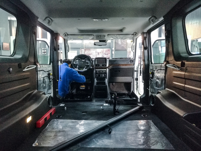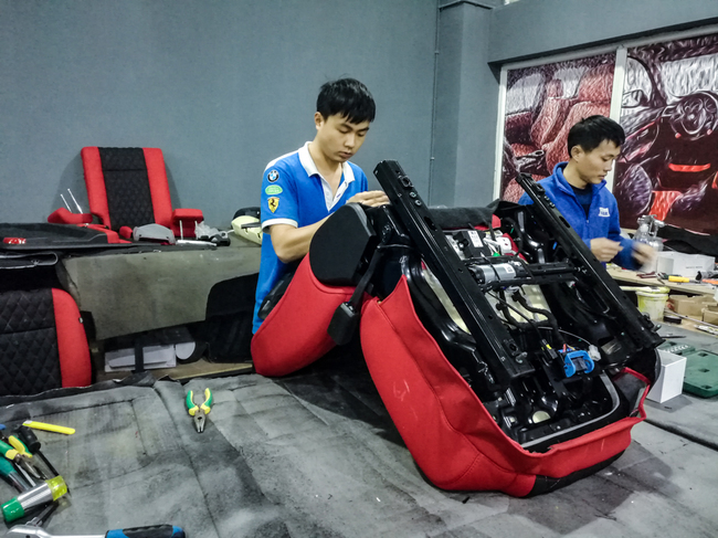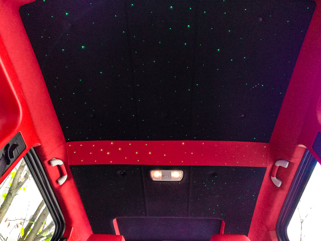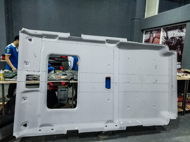 內(nèi)飾安裝過程,首先先把麂皮絨星空頂頂棚裝上,麂皮絨與紅色真皮的搭配把整個(gè)車頂裝飾得更加有韻味