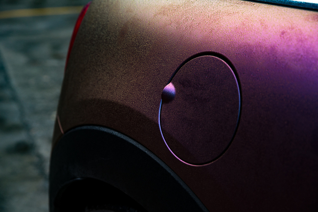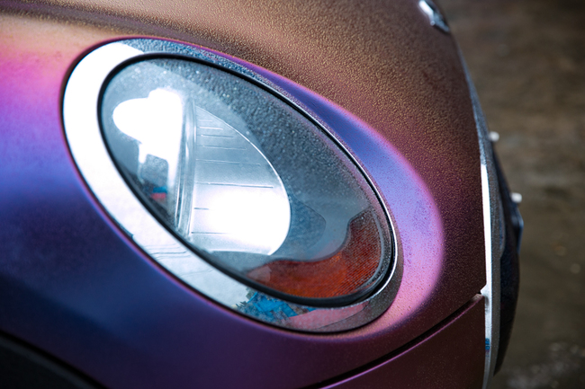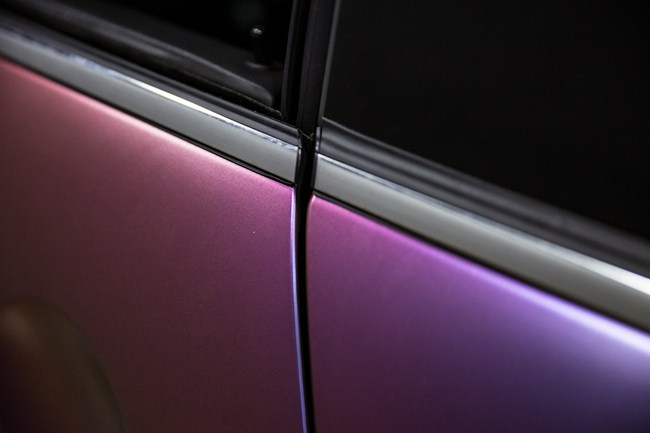 不同的追求不同的炫彩,這次改裝使用的是啞光炫彩紫莓藍(lán)車身膜,剛開始選顏色的時候以為是個很亮的顏色,后來發(fā)現(xiàn),這個顏色更炫,原來表面是啞光的,啞光土黃色的表面,遇到光線瞬間變成紫色,藍(lán)色,甚至藍(lán)莓紅色,個性前衛(wèi),不失淡雅 。