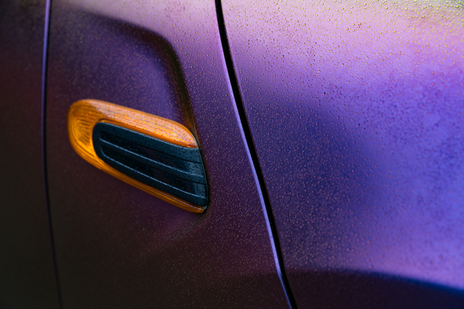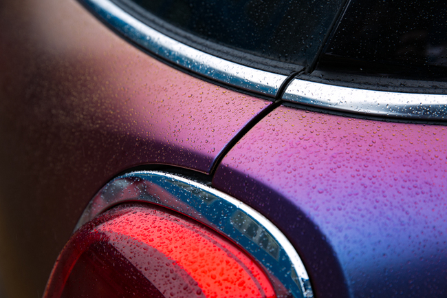 啞光炫彩紫莓藍(lán)局部細(xì)節(jié)圖,一些弧度比較大的地方,精湛的手工技術(shù),將車身膜完美的貼服在大弧度的表面,天公作美,加上細(xì)細(xì)蒙雨的點(diǎn)綴,完美的把個性兩個展示出來了。