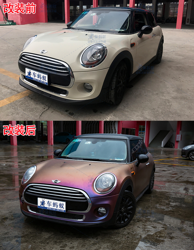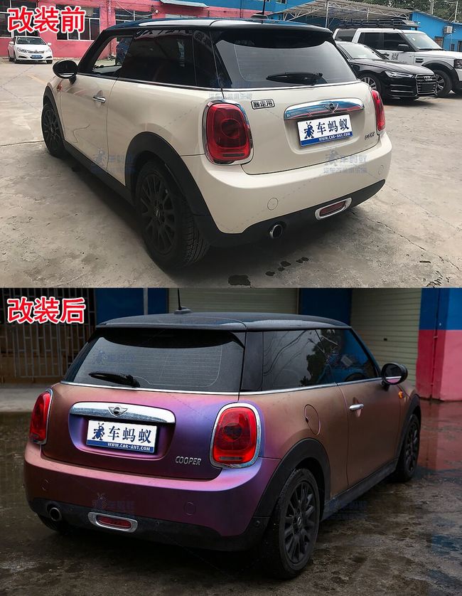 改裝前后對比,原車豐厚的歷史積淀與改裝后時尚的造型將mini變成了汽車中的精靈。精簡、飽滿的線條和炫彩奪目的紫莓藍(lán)并兼具著古典氣息,會讓人產(chǎn)生一種想要把它開回家寵一寵的欲望。
