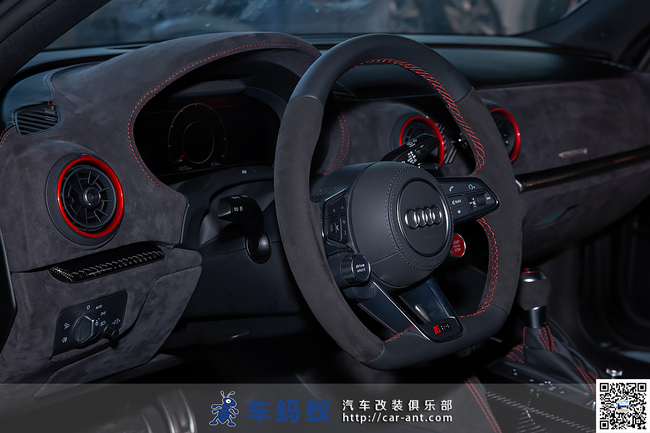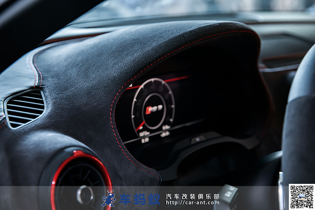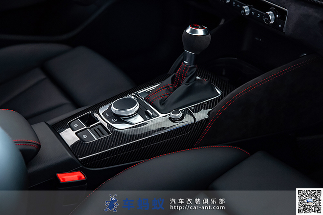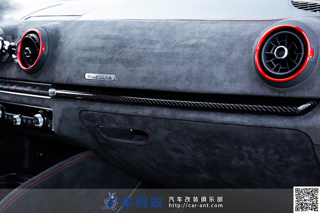 奧迪RS3改黑色Napa皮內(nèi)飾搭配走紅色線儀表臺(tái),碳纖維內(nèi)飾件作點(diǎn)睛之筆。