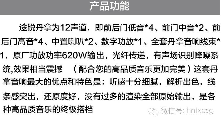 整個改裝過程大致就是這樣,所有的器材完美搭配相互結合,把自己的作用發(fā)揮到極致,使得整車音響效果提升了好多倍!途銳原車無損升級音響最終實現(xiàn)了高中頻通透細膩、低頻強勁震撼,音質(zhì)音效比原車音響有明顯提升!安裝后,客戶極其滿意,超越了客戶預想的效果!當然,我們的專業(yè)也得到了客戶的認定!