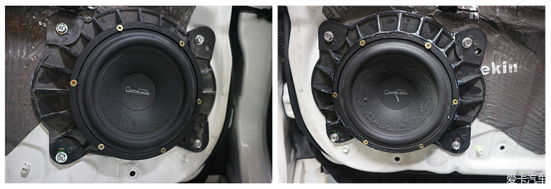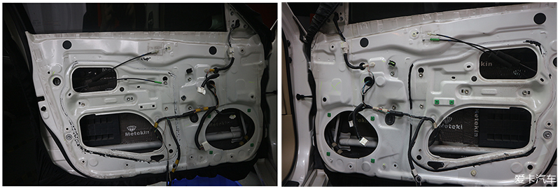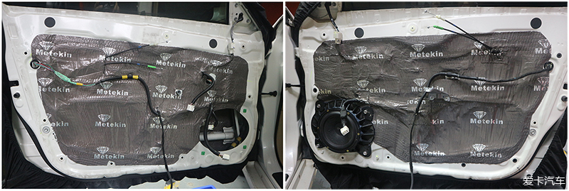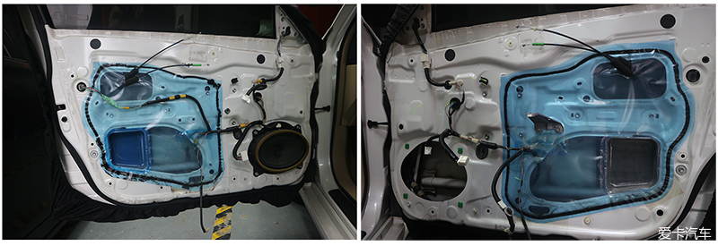 門板第一層減震隔音處理,有效抑制車門共振,提升門板鈑金性能。門板第二層密封隔音處理,有效阻止風噪的侵入,有效提升車門喇叭低頻效果。
