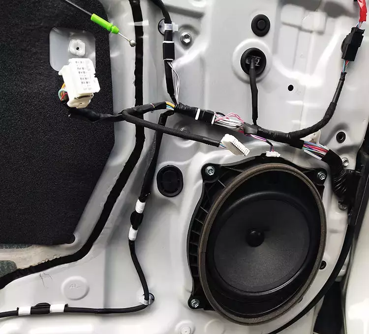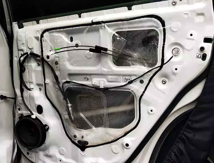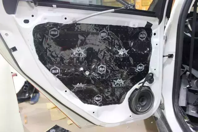 原車門板內(nèi)部只有一層簡單塑料薄膜,最多能防水浸入里面,很難起到良好的隔音效果。改裝音響前,必須對車門做隔音,這是大家都知道的。技師將原車劣質(zhì)隔音材料清除后,使用MAC隔音材料對門板做雙層隔音處理,有效減少門板自身振動(dòng)噪聲以及風(fēng)噪對音響品質(zhì)的干擾,為聲場喇叭創(chuàng)造一個(gè)良好工作環(huán)境。