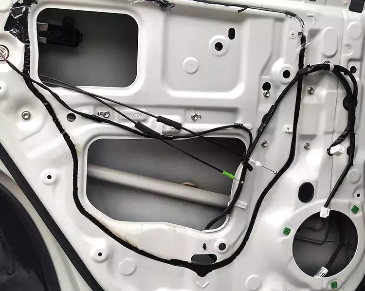 原車隔音,門板內(nèi)部只有一層塑料防水層,毫無隔音效果