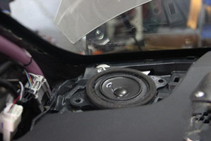 前聲場(chǎng)高音喇叭準(zhǔn)備安裝在儀表臺(tái)原喇叭位置,由于原車?yán)任恢么笮〔町惖膯栴},給要更換的悠揚(yáng)高音喇叭做上墊圈,更利于固定。