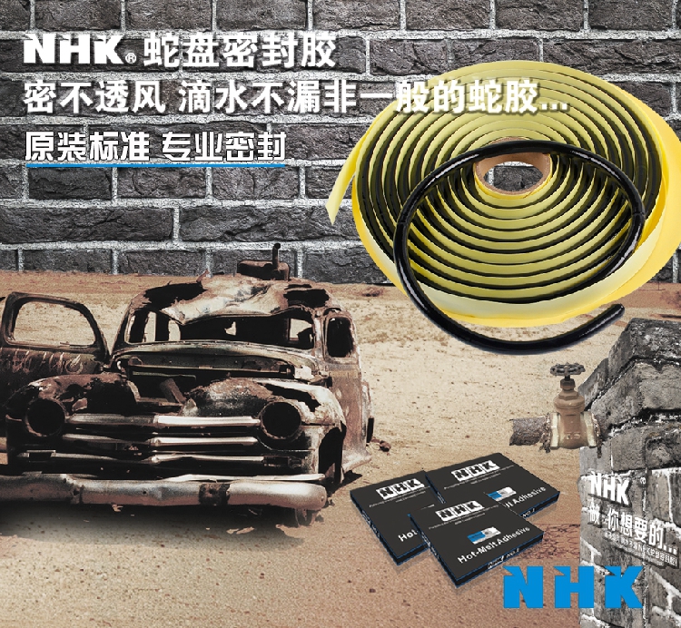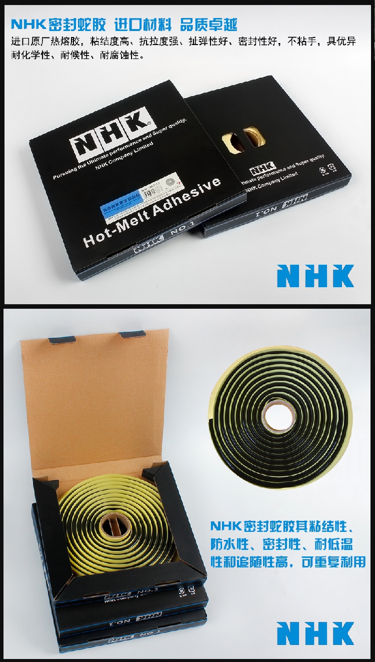 NHK密封蛇膠進(jìn)口原廠熱熔膠,粘結(jié)度高、抗拉度強、扯彈性好,不粘手,具優(yōu)異耐化學(xué)性、耐侯性、耐腐蝕性。