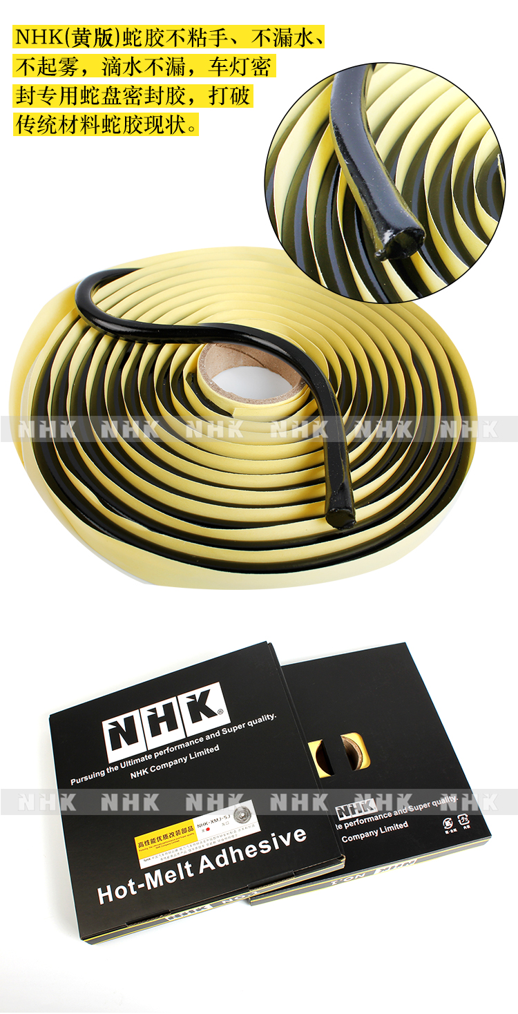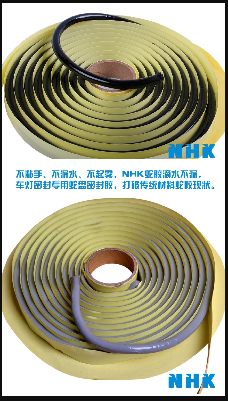 其粘結(jié)性、防水性、密封性、耐低溫性和追隨性高,可重復(fù)利用!不粘手、不漏水、不起霧、NHK蛇膠滴水不漏,車燈密封專用蛇盤密封膠,打破傳統(tǒng)材料蛇膠現(xiàn)狀。