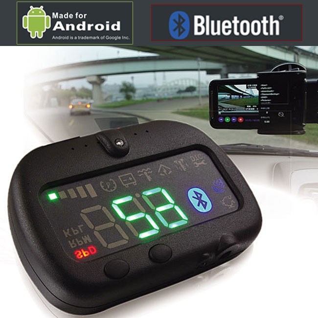 名稱:智能版-抬頭顯示器品牌:SCAT/雷霆貓 (臺(tái)灣研發(fā)制造,專供臺(tái)灣及國外主流大車廠)型號(hào): ET9000A( 適用于 Android手機(jī) )簡介:整合智能型手機(jī)之行車記錄器及GPS之藍(lán)牙多功能OBD2抬頭顯示器產(chǎn)品內(nèi)容:智能版OBD2抬頭顯示器主機(jī),OBD2鏈接線,反射透視鏡膜;功效:與行車電腦鏈接,本裝置用于車輛行進(jìn)間直接在擋風(fēng)玻璃上投射顯示出車速及超速警示、引擎轉(zhuǎn)速、耗油量、點(diǎn)火位置、水溫、電力等重要安全參數(shù),直接平視無時(shí)差可實(shí)時(shí)提醒駕駛?cè)俗⒁庑熊囆畔?此為有效提升行車安全及自我測試汽車效能所設(shè)計(jì)之設(shè)備。另添加了藍(lán)牙無線傳輸,將車載信息遞送至智能型手機(jī)Smart Phone,使車主在其手機(jī)平臺(tái)內(nèi)可以運(yùn)用各APP軟件,使其可整合GPS及錄像功能上升級(jí)為全功效的行車記錄器;亦可利用軟件做為汽車電腦的診斷器