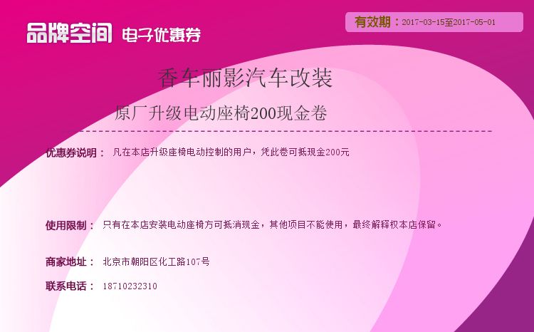 消費(fèi)券介紹:凡在本店升級座椅電動(dòng)控制的用戶,憑此卷可抵現(xiàn)金200元