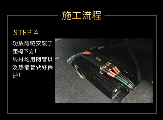 功放則是隱藏安裝座椅下方,線材均用網(wǎng)管和熱縮管做好相應(yīng)的保護(hù)!兩路推前聲場(chǎng)雷貝琴R6L,然后橋接兩路推雷貝琴低音炮,橋接之后功率翻倍,推雷貝琴P10S低音炮則恰到好處!