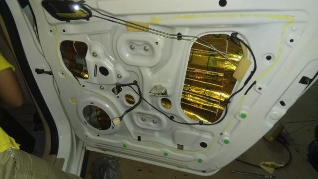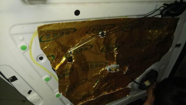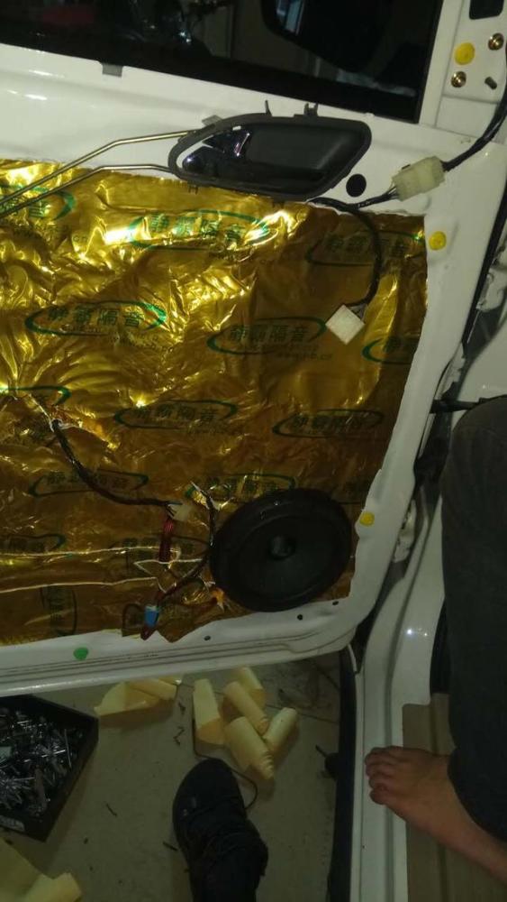 寶駿原車門板沒有做過隔音處理, 隔音效果自然很差。因此四門隔音必做不可。改裝師傅嫻熟地拆開車門板后,撕掉塑料膜后在內(nèi)板貼上條形隔音條,有效止振門板共響。第二層平鋪貼上隔音材料,這樣做的目的是使車門內(nèi)的門板鐵皮共鳴聲降到最低,也能夠使車門內(nèi)部形成一個很好的密封箱體,是喇叭的音效發(fā)揮得更好。