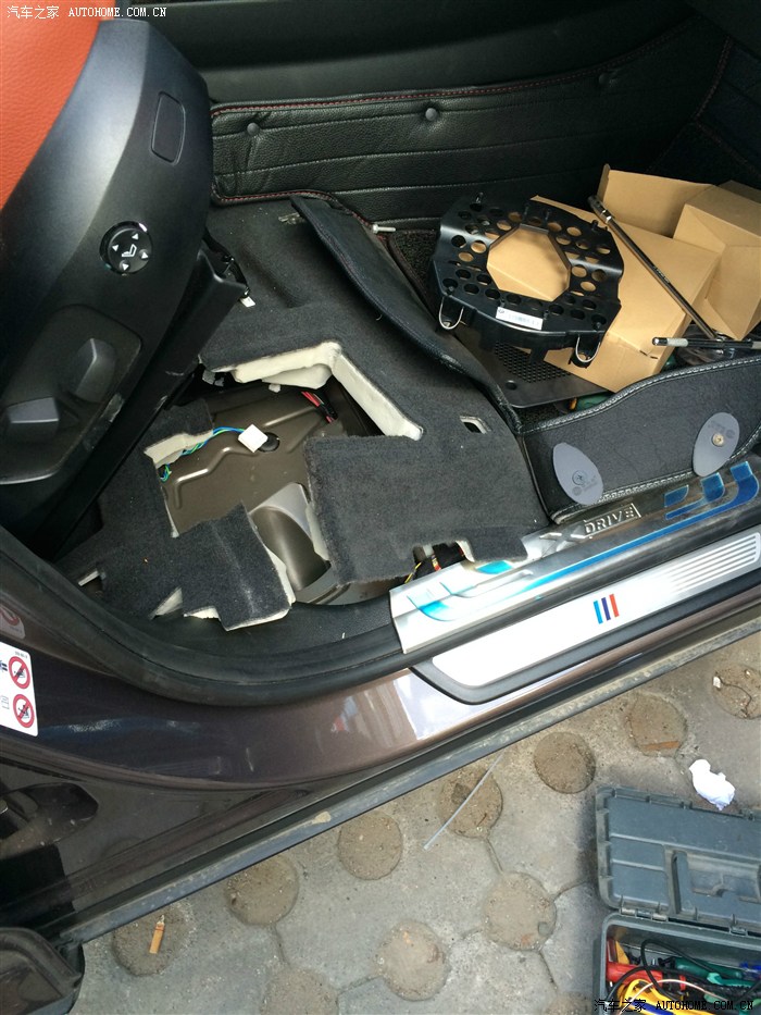 拆低音底座,因?qū)汃R低音在正副駕駛位置,故需要把座椅挪開,一片狼藉啊。。。好在師傅專業(yè)