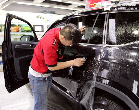 專業(yè)的技師用專業(yè)的工具將貼膜安裝液趕干凈: