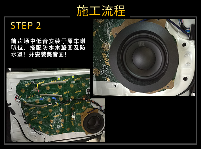 ?門板做完隔音處理后,前聲場喇叭安裝于原車?yán)任?,這套喇叭能夠準(zhǔn)確表達(dá)出聲音的每一個細(xì)節(jié),在聲音的質(zhì)感方面表現(xiàn)非常突出!