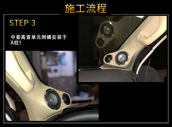 ?中音和高音單元倒模安裝于A柱,提升系統(tǒng)的聲場定位感,有利于整體聲場定位精準表現(xiàn)!