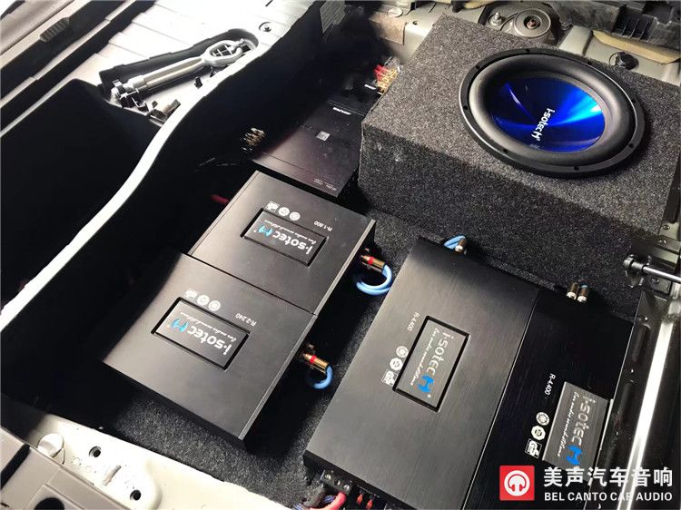 尾箱是器材展示的大舞臺,也是技師花費(fèi)最多工時的地方,然而,亮相在眼前的是十分簡潔與平整的改裝手法,四臺功放和一只超低音還有兩臺艾索特6路DSP排列安裝在尾箱,線材做好保護(hù),德國艾索特參考級功放強(qiáng)勁的動力表現(xiàn),推動寶馬專用喇叭單元,釋放純美透徹的音質(zhì)效果,堪稱絕配。