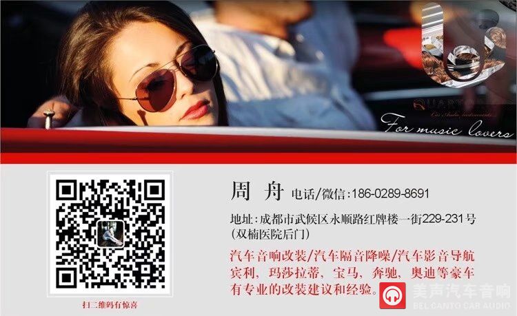 溫馨提示:成都美聲汽車音響改裝店只此一家,別無分店。本案例圖文介紹屬成都美聲版權(quán),未經(jīng)許可不能私自轉(zhuǎn)載,如有疑問可咨詢本店店主:18602898691 周舟(微信同號),再次感謝你的關(guān)注!