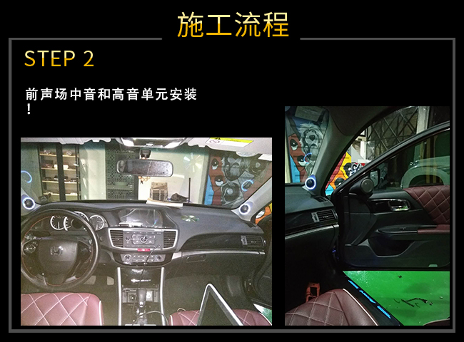 前聲場RV6.3喇叭中音和高音單元安裝特寫,根據(jù)車內(nèi)環(huán)境聲學(xué)以及整體的協(xié)調(diào)性將中音和高音單元安裝,這樣做的好處是可拉寬整個前聲場,使音樂表現(xiàn)現(xiàn)場感更佳。