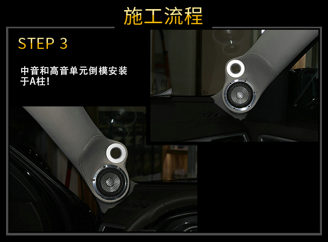 中音和高音單元倒模安裝于A柱,這樣既可以保證中音高音角度良好,同時也可以保證內(nèi)飾美觀!