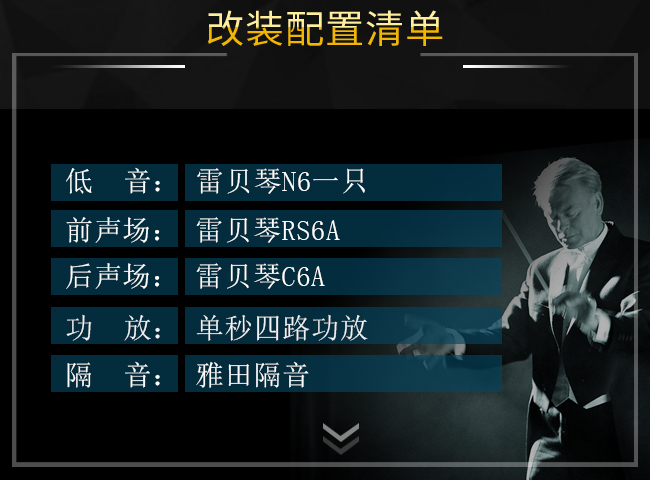前聲場中低音安裝雷貝琴RS6A,音盆采用進口鋁鎂合金拉伸成型,高頻清晰細膩、通透開揚,中頻韻味醇厚,低頻收放自如,完美演繹每一個音樂細節(jié),暢享鑒賞級音樂。