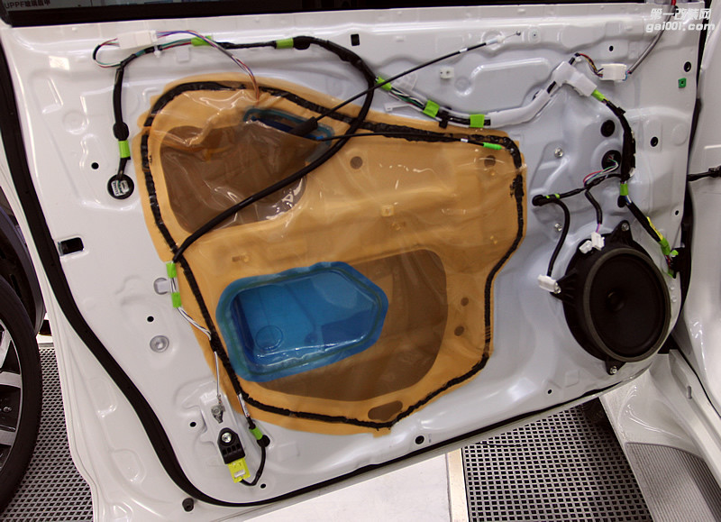 原車門板拆下。里面就一層塑料,僅僅起到防水防塵的效果,對原車音響沒有任何改善: