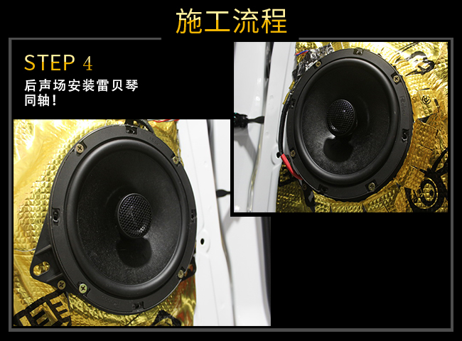 后聲場(chǎng)喇叭安裝雷貝琴同軸喇叭,音色溫暖自然,聲音彈性好,演繹人聲有非常不錯(cuò)的表現(xiàn),比較適合做聲場(chǎng)使用!