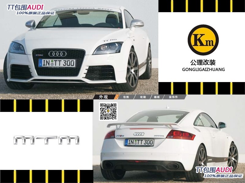 上海KM改裝俱樂部擁有歐洲MANSORY、HAMANN、LUMMA、KAHN等三十多個(gè)專門針對(duì)保時(shí)捷、路虎、奔馳、寶馬、奧迪、進(jìn)口大眾六大汽車品牌的改裝產(chǎn)品,并擁有專業(yè)的設(shè)計(jì)團(tuán)隊(duì)為高端車主提供個(gè)性化定制服務(wù)。KM將成為全國(guó)范圍內(nèi)產(chǎn)品最廣、單位面積最大、設(shè)施最齊全、檔次最高的國(guó)際超級(jí)豪車改裝旗艦店。此產(chǎn)品:AUDI TT全進(jìn)口原裝包圍MTM品牌。