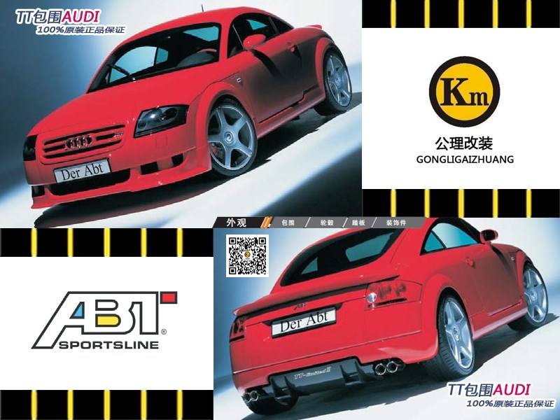 上海KM改裝俱樂部擁有歐洲MANSORY、HAMANN、LUMMA、KAHN等三十多個(gè)專門針對(duì)保時(shí)捷、路虎、奔馳、寶馬、奧迪、進(jìn)口大眾六大汽車品牌的改裝產(chǎn)品,并擁有專業(yè)的設(shè)計(jì)團(tuán)隊(duì)為高端車主提供個(gè)性化定制服務(wù)。KM將成為全國(guó)范圍內(nèi)產(chǎn)品最廣、單位面積最大、設(shè)施最齊全、檔次最高的國(guó)際超級(jí)豪車改裝旗艦店。此產(chǎn)品:AUDI TT全進(jìn)口原裝包圍ABT品牌。