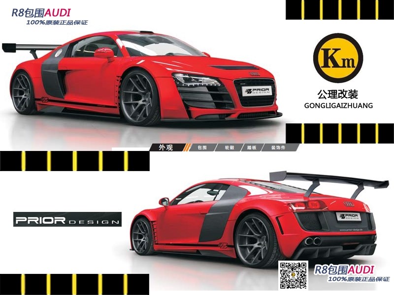上海KM改裝俱樂部擁有歐洲MANSORY、HAMANN、LUMMA、KAHN等三十多個(gè)專門針對(duì)保時(shí)捷、路虎、奔馳、寶馬、奧迪、進(jìn)口大眾六大汽車品牌的改裝產(chǎn)品,并擁有專業(yè)的設(shè)計(jì)團(tuán)隊(duì)為高端車主提供個(gè)性化定制服務(wù)。KM將成為全國范圍內(nèi)產(chǎn)品最廣、單位面積最大、設(shè)施最齊全、檔次最高的國際超級(jí)豪車改裝旗艦店。此產(chǎn)品:AUDI R8全進(jìn)口原裝包圍Prior品牌。