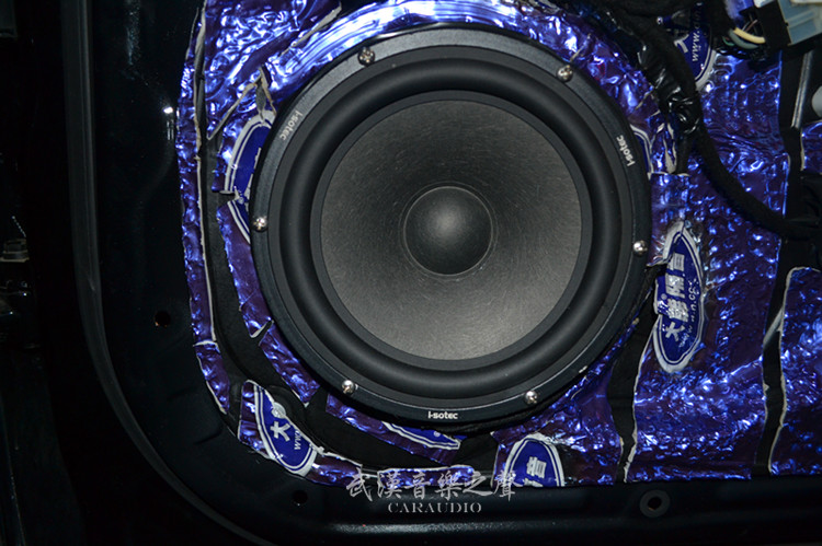 好音樂(lè)的展現(xiàn),需要一個(gè)舒適的聽音環(huán)境。所以在喇叭安裝前,改裝師先使用大能隔音材料對(duì)車門進(jìn)行雙層隔音,減少鈑金共振和風(fēng)噪傳入,提升喇叭的音質(zhì)效果。門板內(nèi)層隔音后,將德國(guó)艾索特RE165.3中低音喇叭安裝在前門板原位。