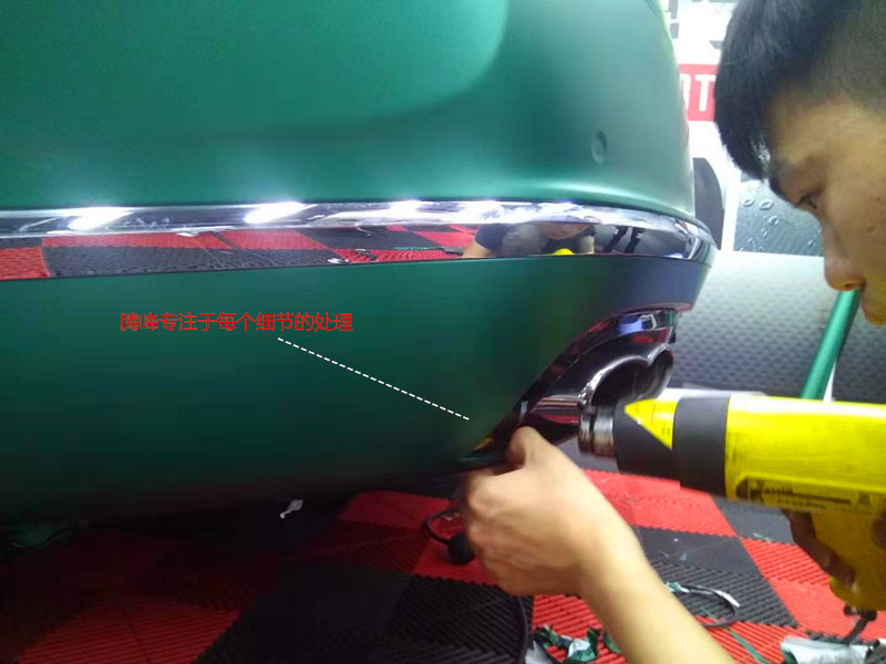騰峰汽車(chē)俱樂(lè)部貼膜師傅正在專(zhuān)注地施工后保險(xiǎn)杠祖母綠顏色象征著仁慈、信心、善良、永恒、幸運(yùn)和幸福,它會(huì)給車(chē)主人帶來(lái)一生的平安。