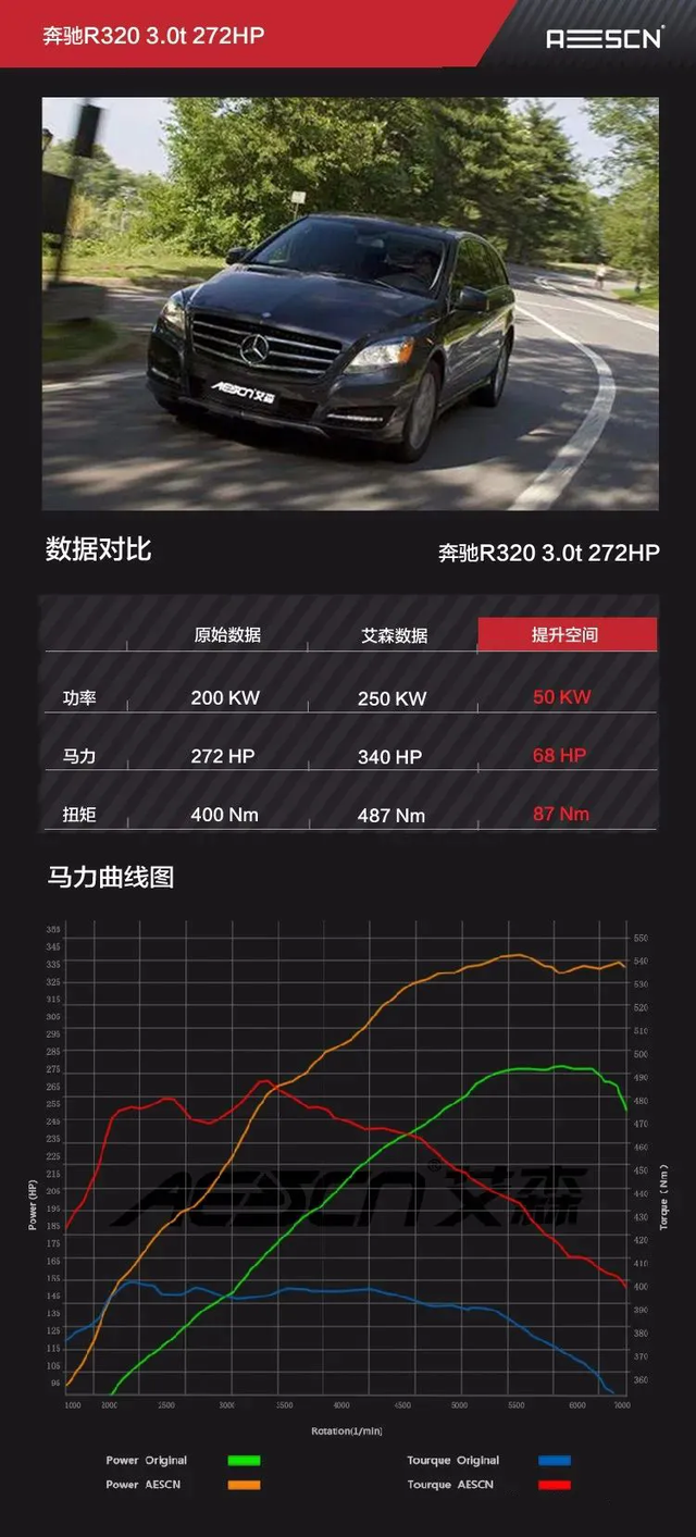 艾森發(fā)布奔馳R320 3.0T程序方案:一切以安全、穩(wěn)定為前提,在不損傷發(fā)動機(jī)壽命前提下,將動力優(yōu)化至最佳,同時符合車主的駕駛需求,性能參數(shù)如下: