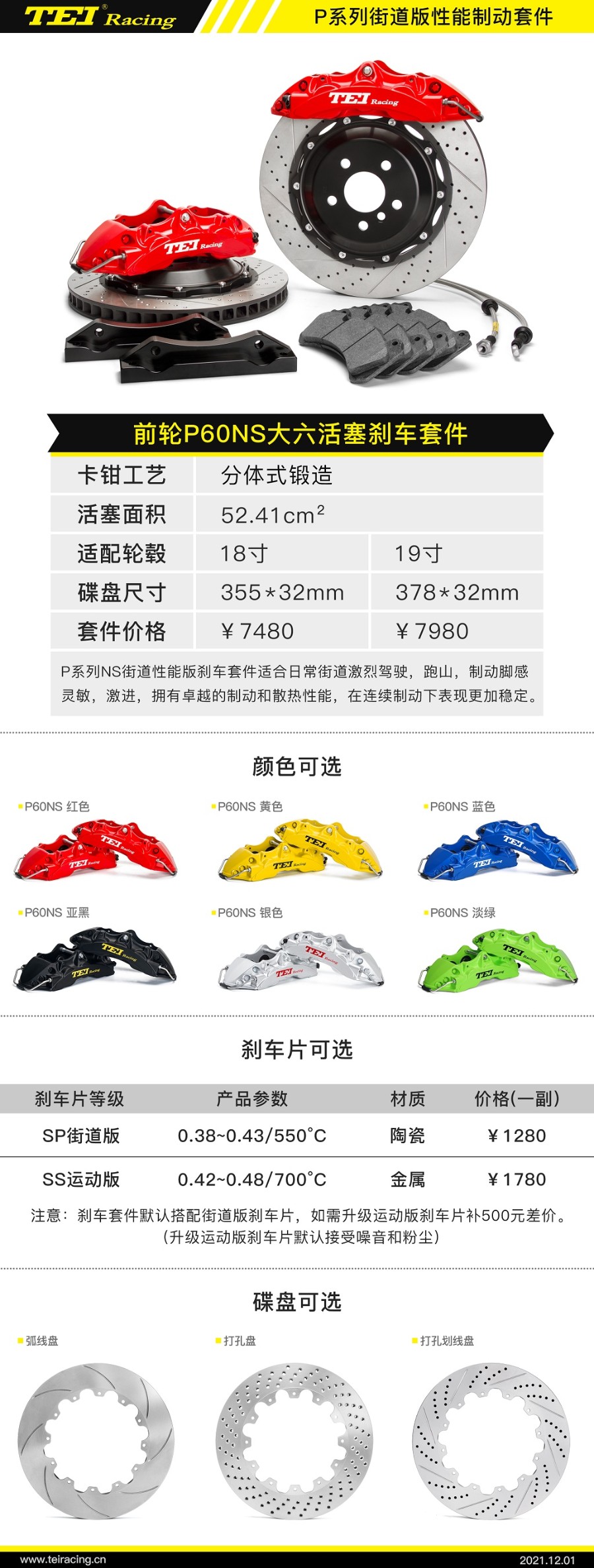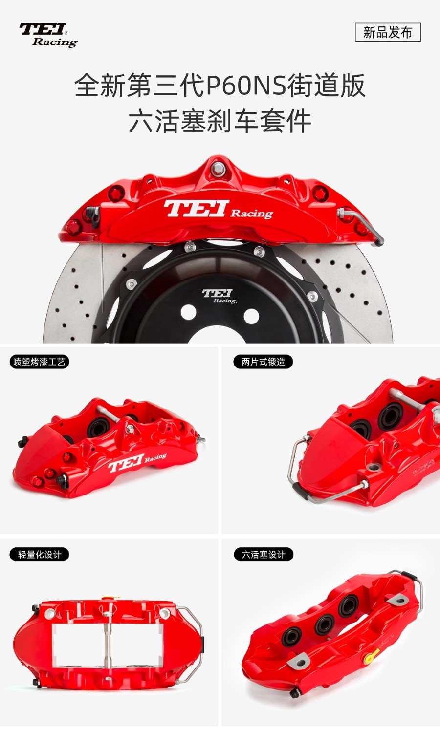 TEI Racing P60NS街道版高性能剎車卡鉗套件,采用了第三代全新的設(shè)計語言,在外觀和內(nèi)部結(jié)構(gòu)上都做了很多升級,全面提升汽車制動性能。匹配剎車片摩擦面積相較于P系列上一代增加20%,剎車性能提升13%,有效縮短剎車制動距離!